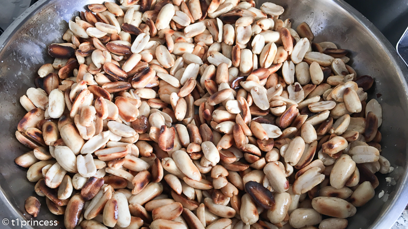 - Na ulje dodati sirovi oljušteni kikiriki i peći otprilike 20 minuta stalno mješajući dok ne potamni. Po želji posoliti.